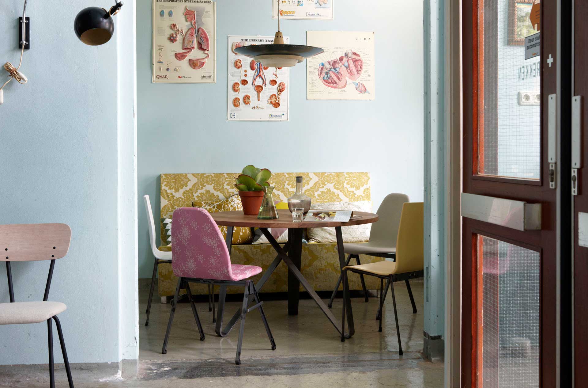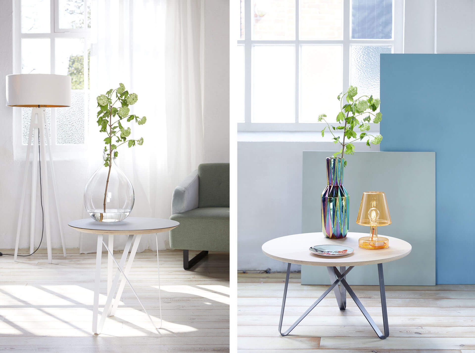 For the Dutch brand Spoinq I came up with the Twister side table series. The initial concept was to let the legs of the Twister gracefully curl down and support the tray. The thin steel strip looks like a ribbon. There is a version with blank steel legs and with powder coated black legs. A dining table is also available.